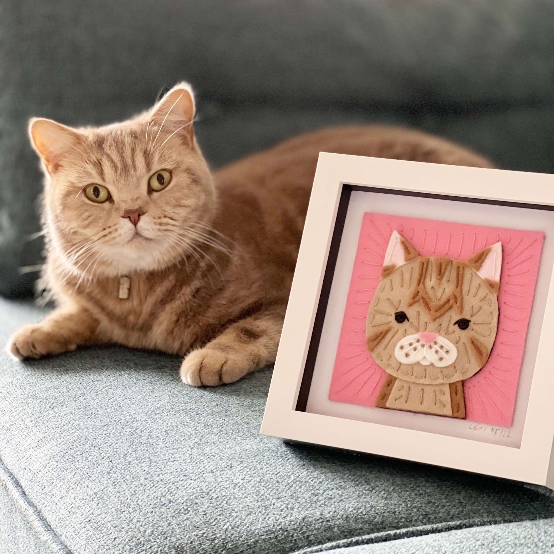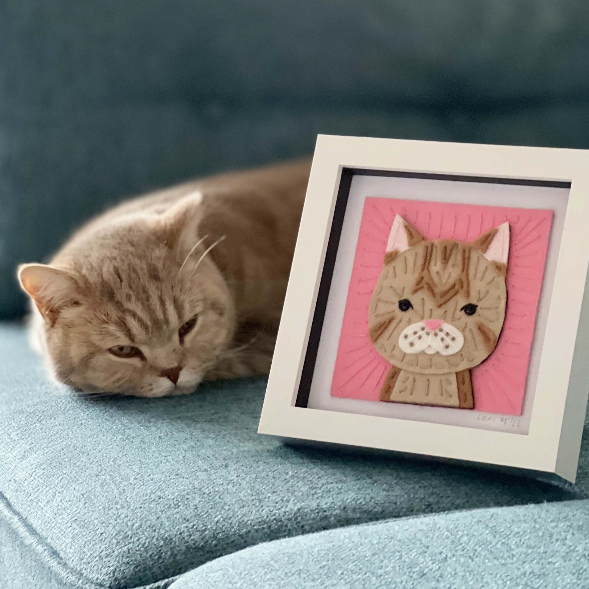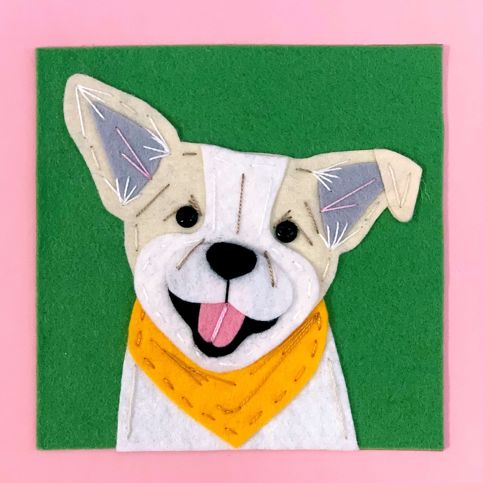 To create your pet portrait, simply send Miss Shelly a photo of your pet and she will sketch your pet and then use the drawing as a pattern to cut the layers of felt from, these will be used to form your artwork. The material pieces will then be hand-stitched together to form the portrait.