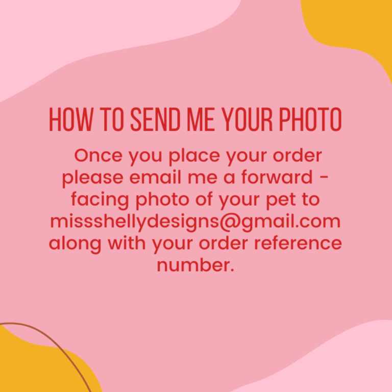 Place your order by adding the listing to your basket. Choose your background colour from the options bar. Once your order is complete please email me a forward-facing photo of your pet to missshellydesigns@gmail.com.