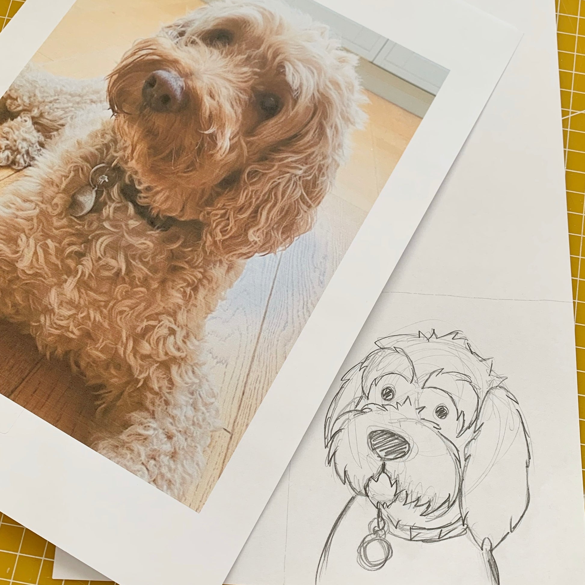 Once complete, the artwork is finished off in a white square frame. You will also receive the original sketch Miss Shelly drew of your pet.