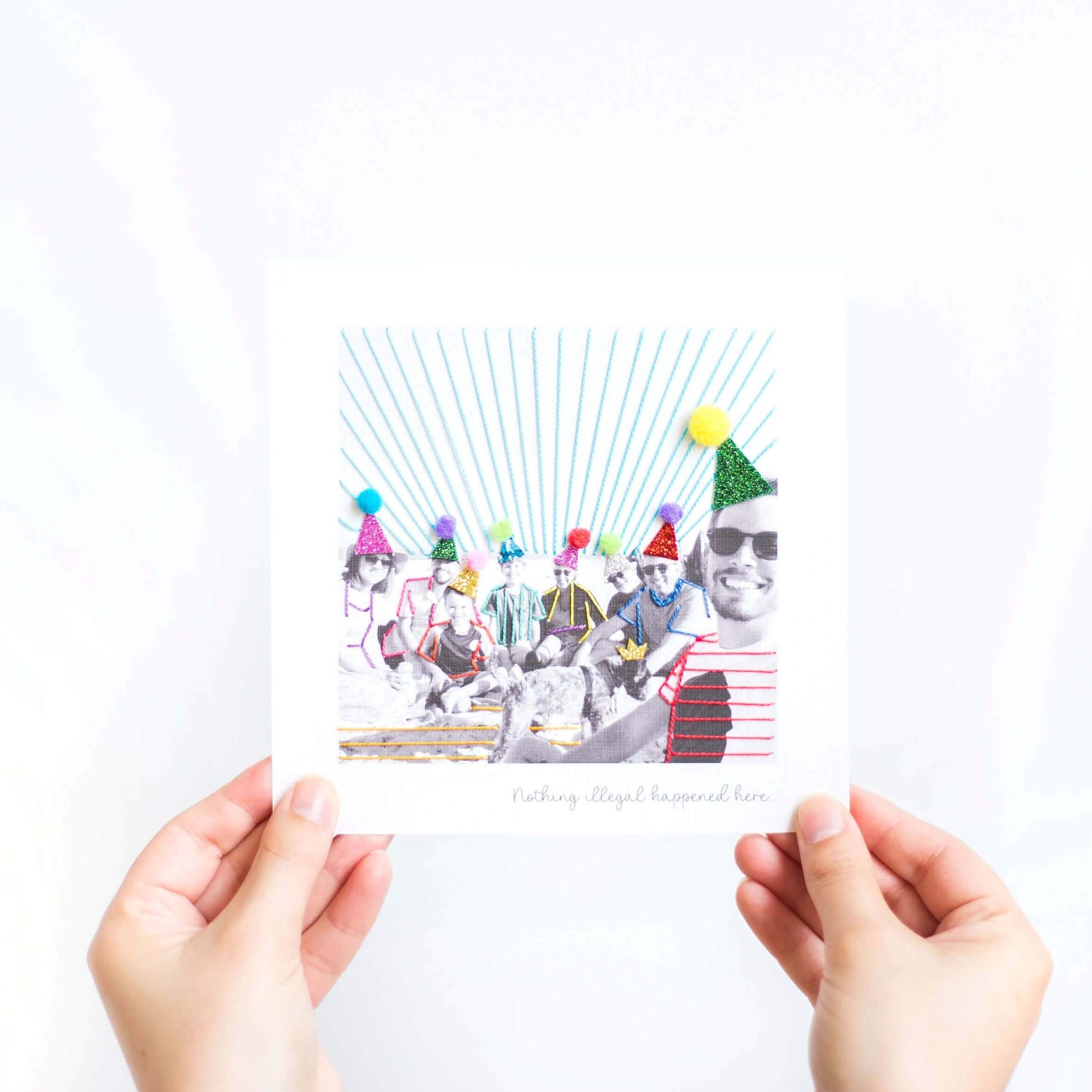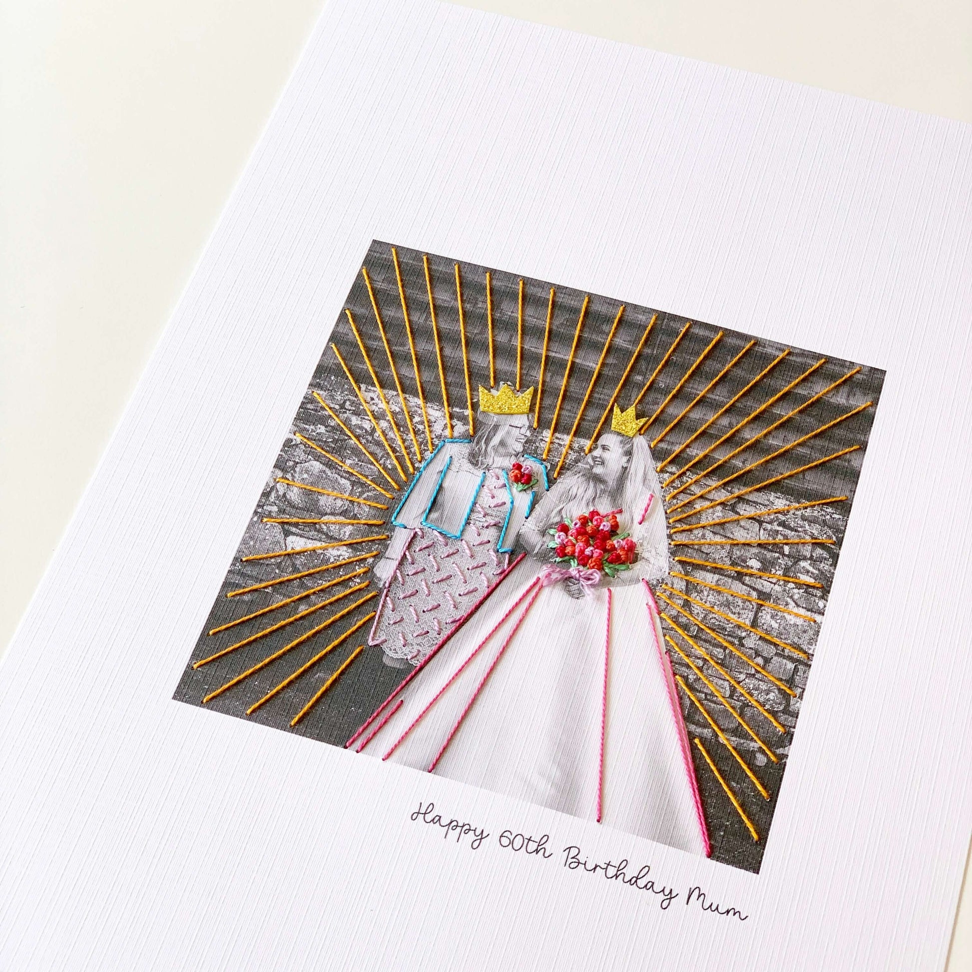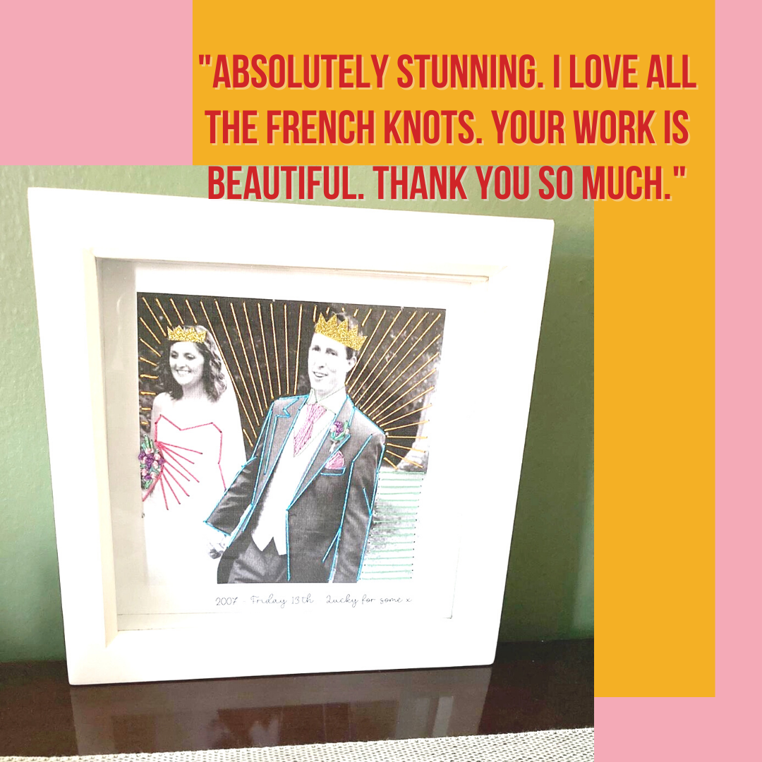 She will create a black and white version of your photo and print it onto beautiful linen card. She will then add colourful embroidery to highlight the detail.
