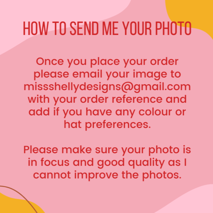 Once you place your order please email your image to missshellydesigns@gmail.com with your order reference and add if you have any colour or hat preferences.