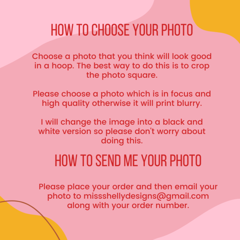 When you place your order please send a photo to missshellydesigns@gmail.com along with your order number. Please make sure that your photo can fit in a circle, the best way to do this is t crop the image square. Don't worry about making a black and white version as I will do this.