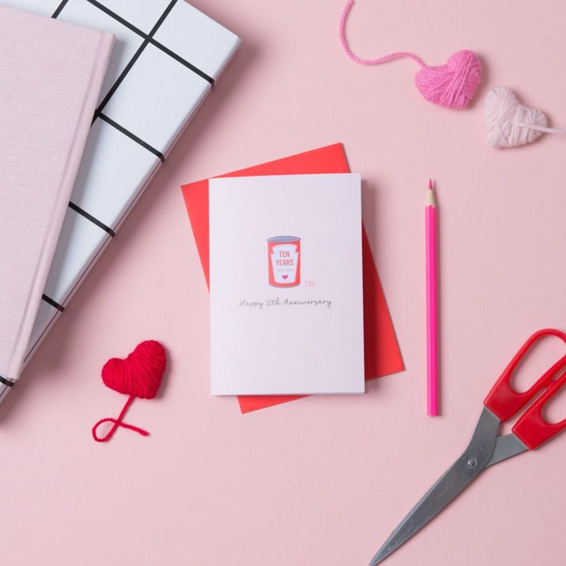 This tenth-anniversary card has an illustration of a tin can on the front. It is the perfect card to give your partner, wife, husband, girlfriend or boyfriend for your anniversary. It's also a great choice to send friends or family members who are celebrating their 10th wedding anniversary and can even be sent directly with a handwritten message.