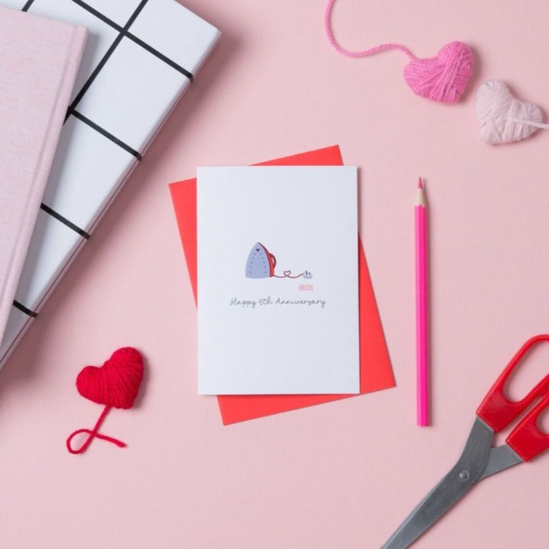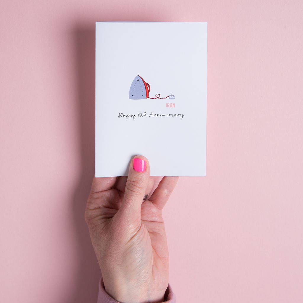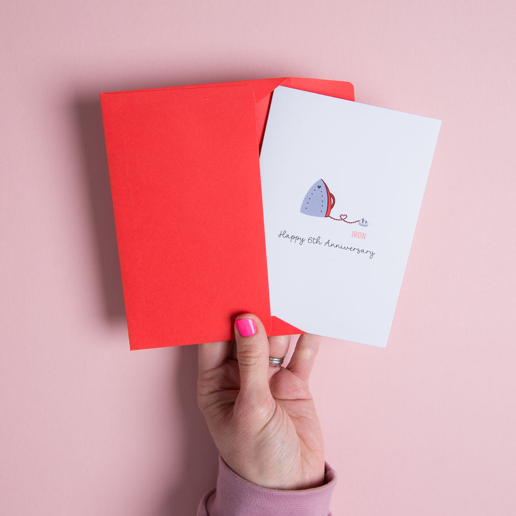 This sixth-anniversary card has an illustration of a iron on the front (for a bit of fun!) and is the perfect card to give your partner, wife, husband, girlfriend or boyfriend for your anniversary. It's also a great choice to send friends or family members who are celebrating their 6th wedding anniversary and can even be sent directly with a handwritten message.