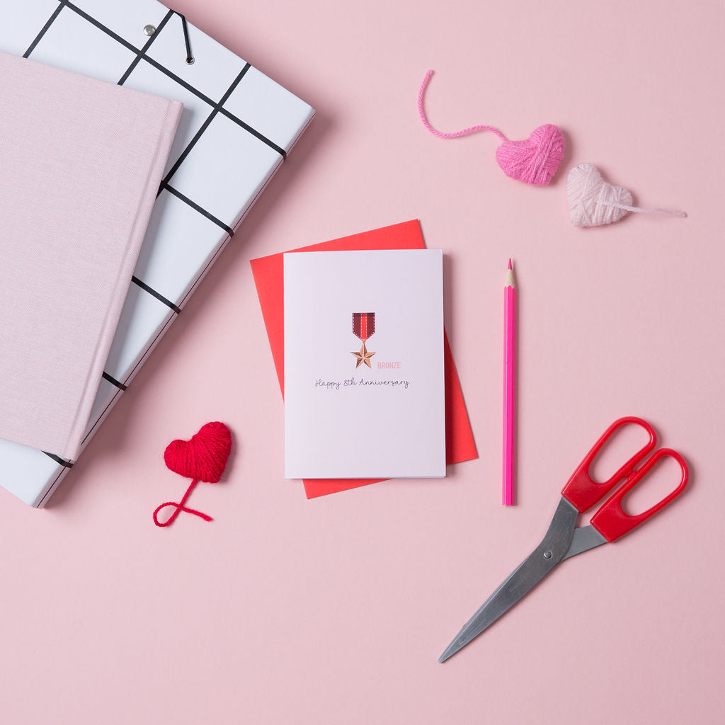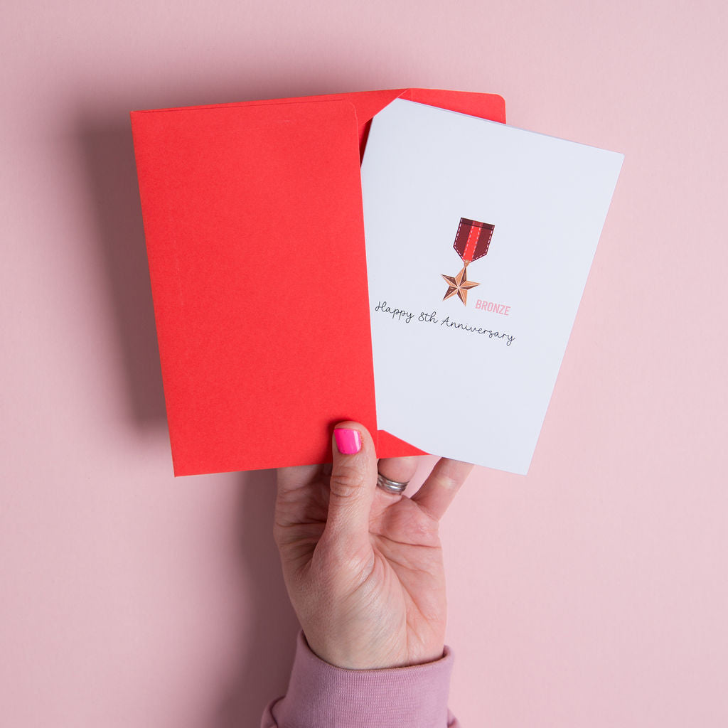 This eighth-anniversary card has an illustration of a bronze medal on the front. It is the perfect card to give your partner, wife, husband, girlfriend or boyfriend for your anniversary. It's also a great choice to send friends or family members who are celebrating their 8th wedding anniversary and can even be sent directly with a handwritten message.
