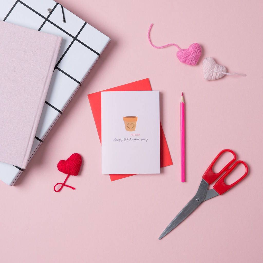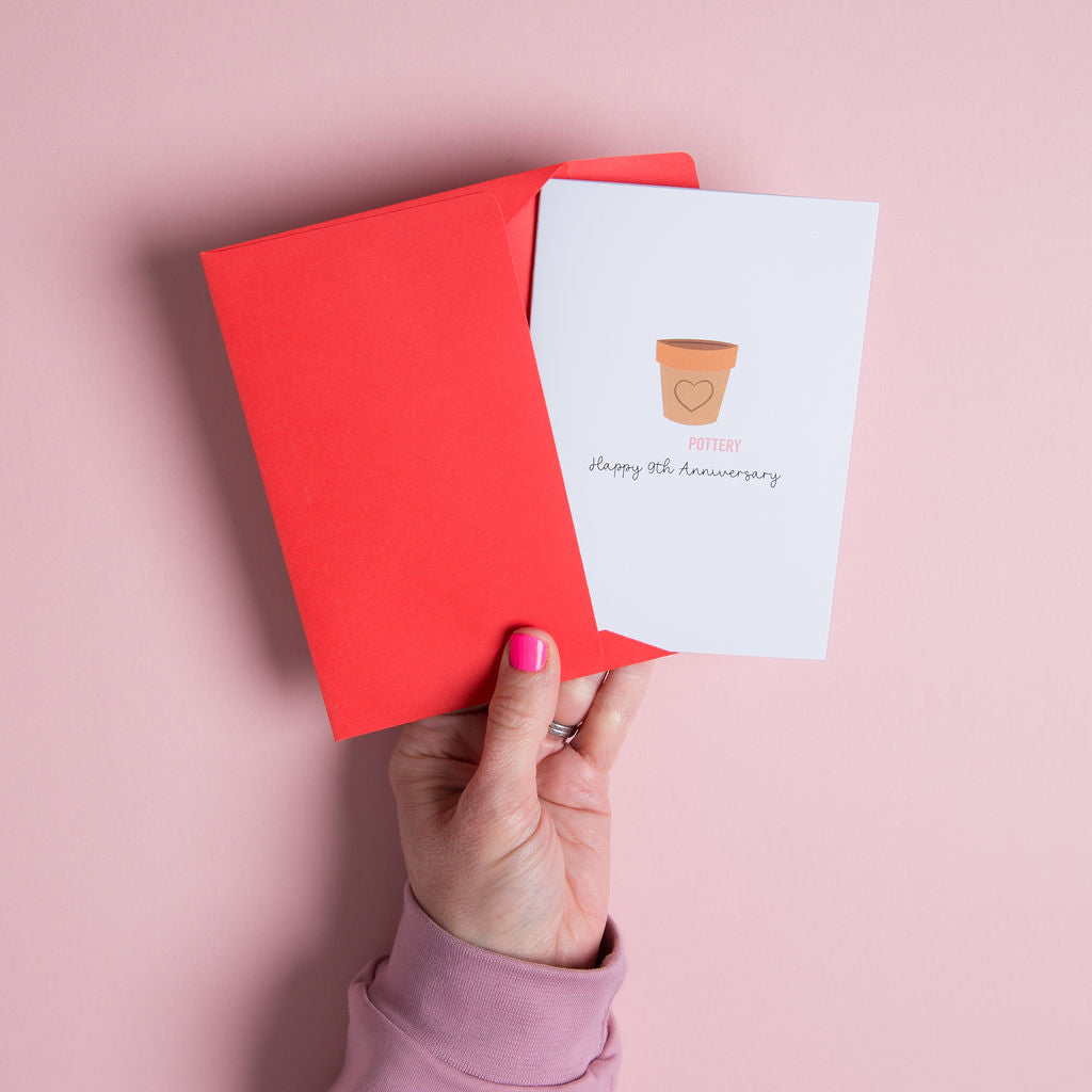 This ninth-anniversary card has an illustration of a flower pot on the front. It is the perfect card to give your partner, wife, husband, girlfriend or boyfriend for your anniversary. It's also a great choice to send friends or family members who are celebrating their 9th wedding anniversary and can even be sent directly with a handwritten message.