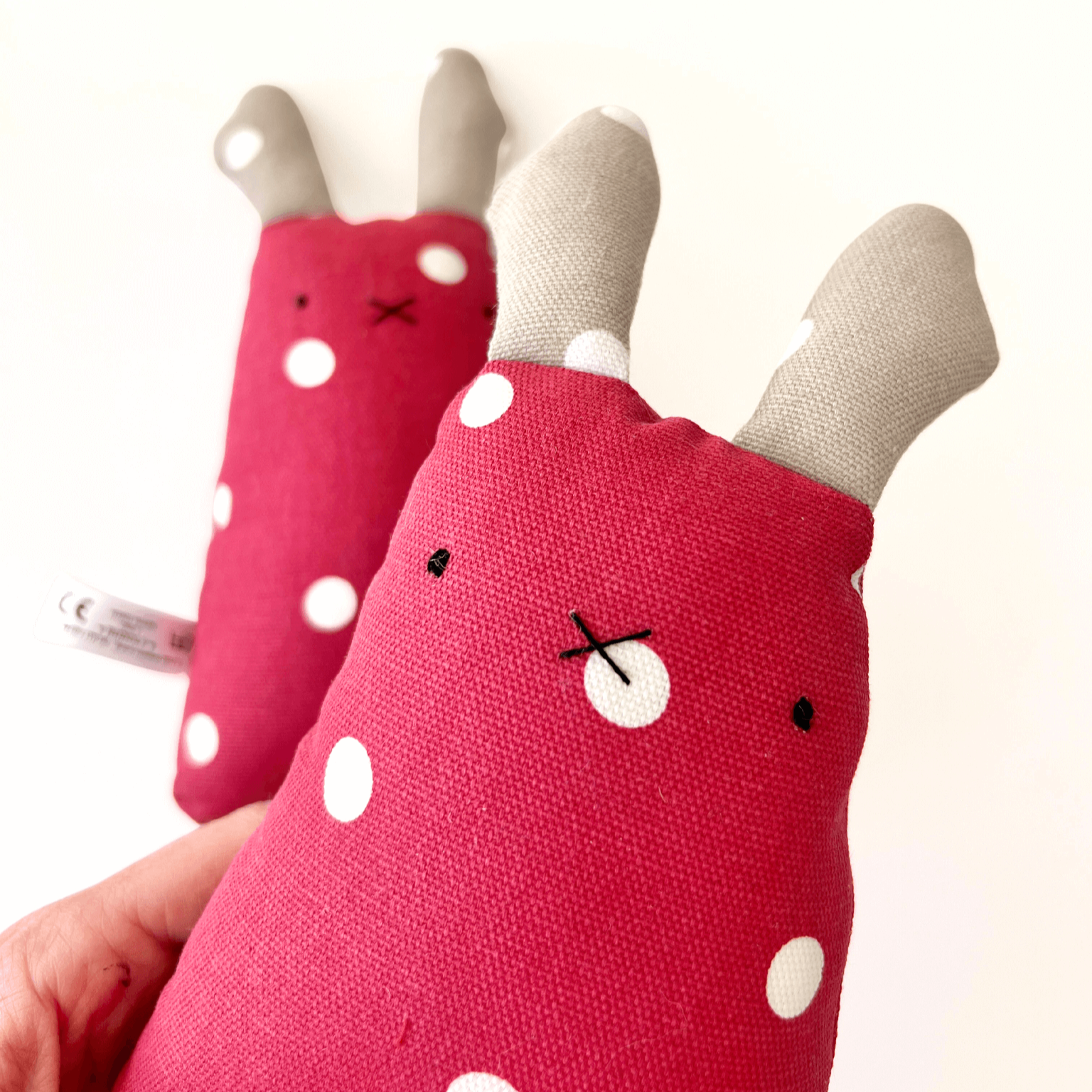This charming Rudolf toy is handmade and features a squeaker inside for extra fun. His face is carefully hand-embroidered, giving him a unique and playful personality.