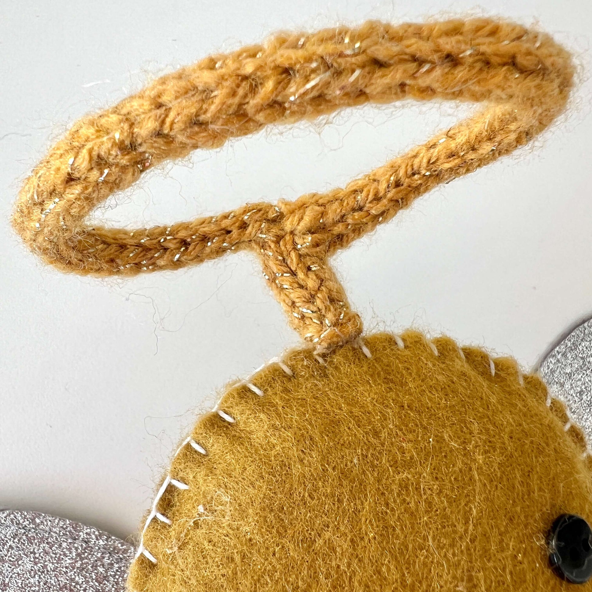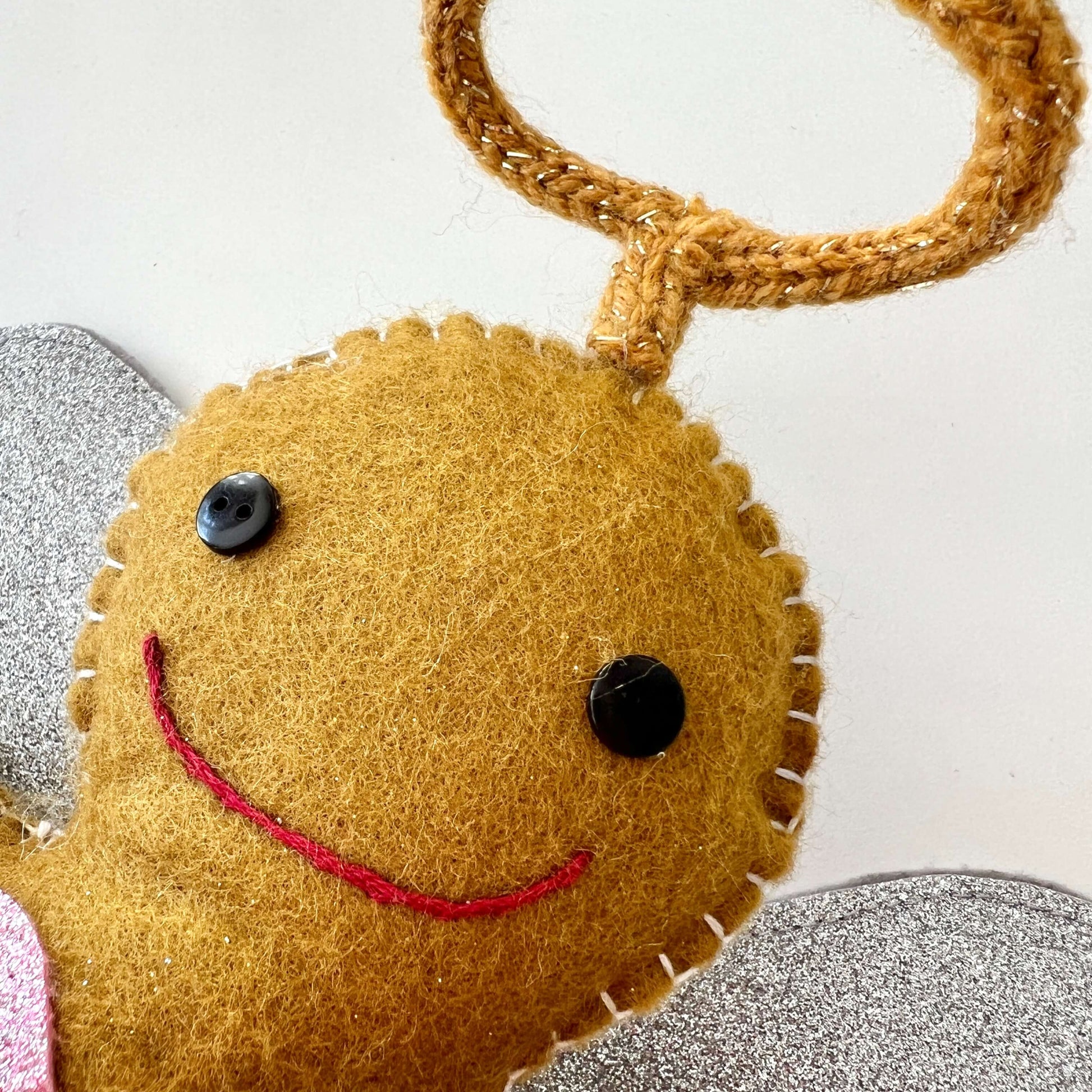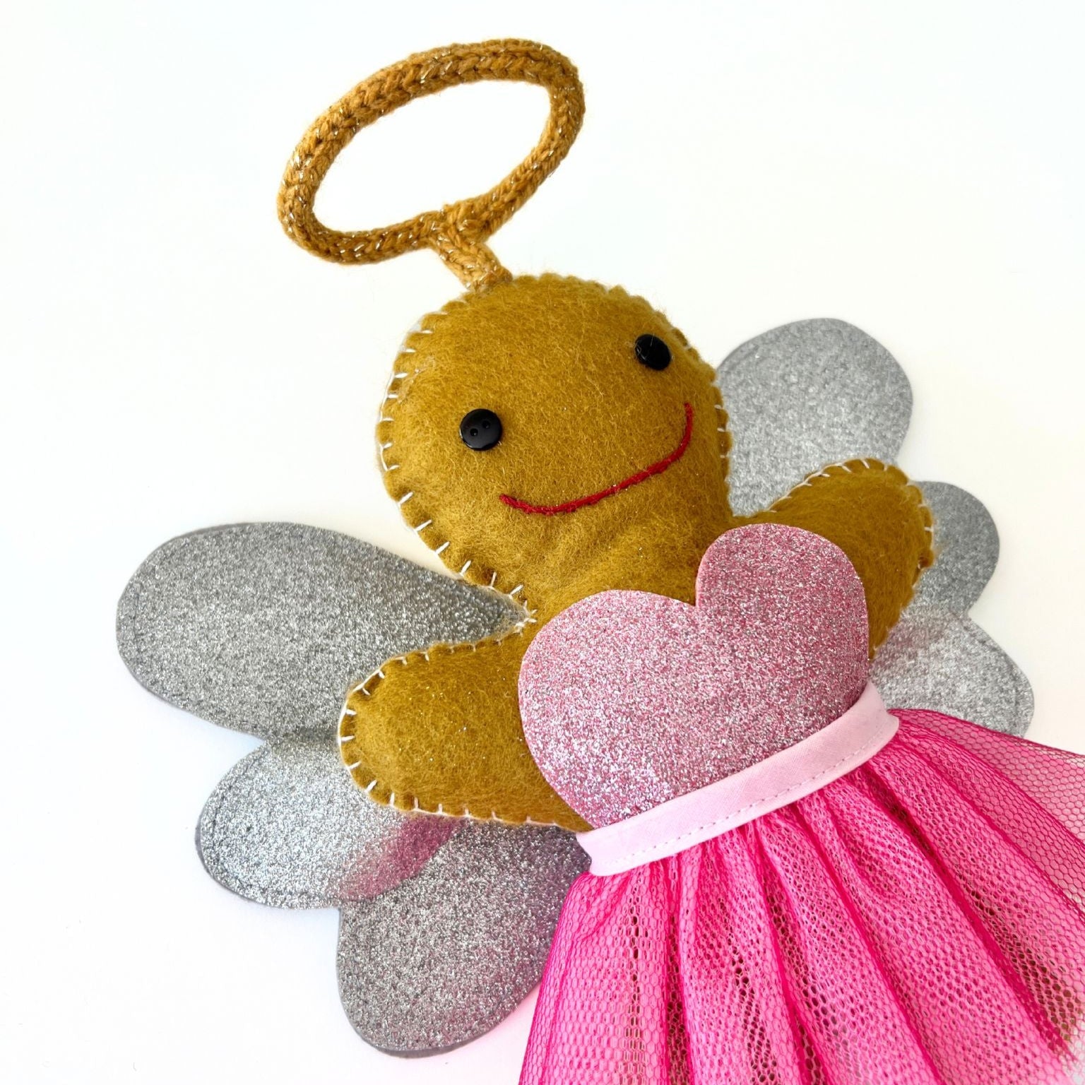 This adorable gingerbread angel tree topper, sporting a pink tutu and glittery bodice, is a charming ex-display piece. She’s a little fluffy in spots but will still shine beautifully atop your Christmas tree. Featuring a hand-knitted halo and sparkling silver wings, she’s sure to add a playful touch to your holiday decor.