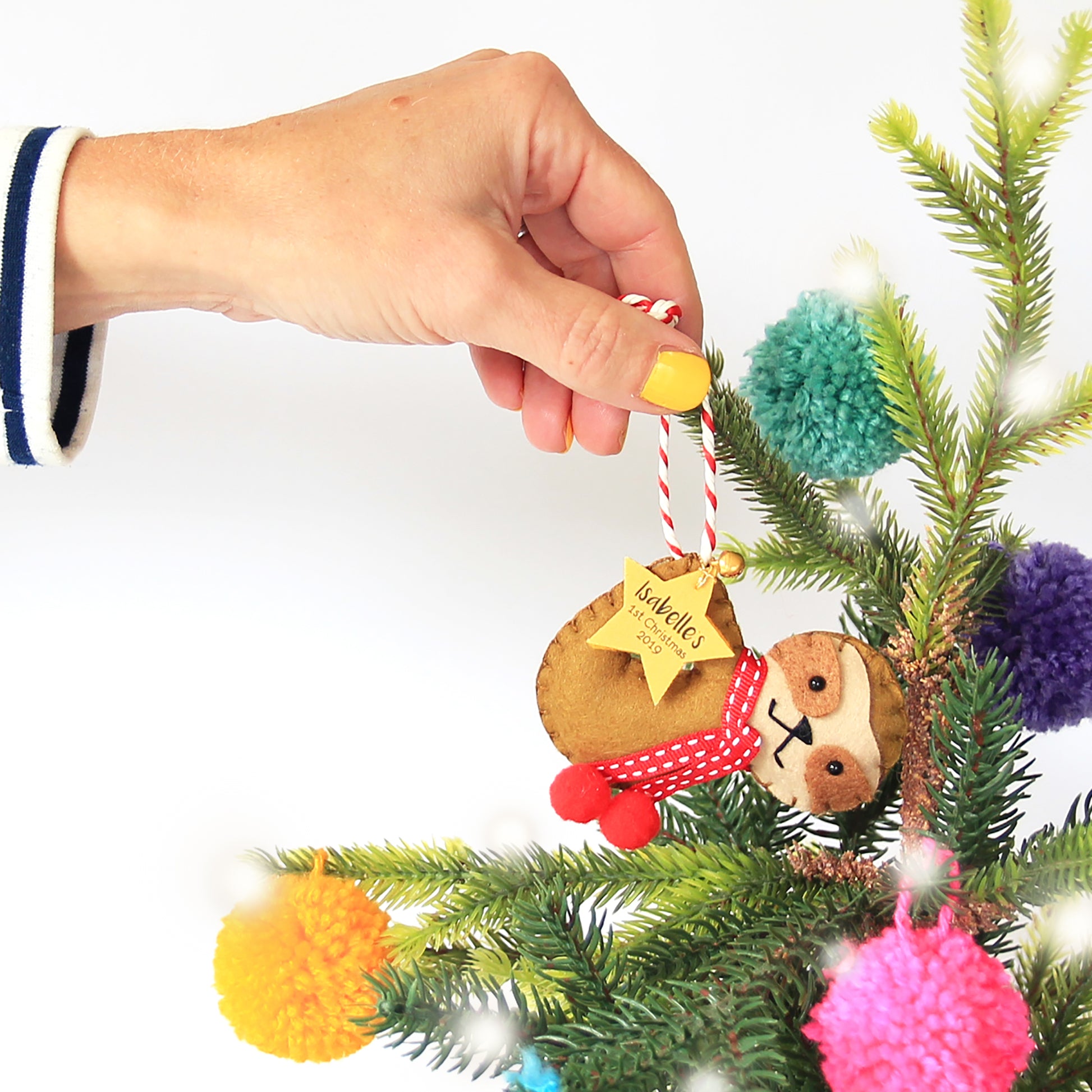 You can personalise the sloth Christmas ornament with a name or message which will be printed on a small hand crafted yellow star tag. The star tag is made from felt.
