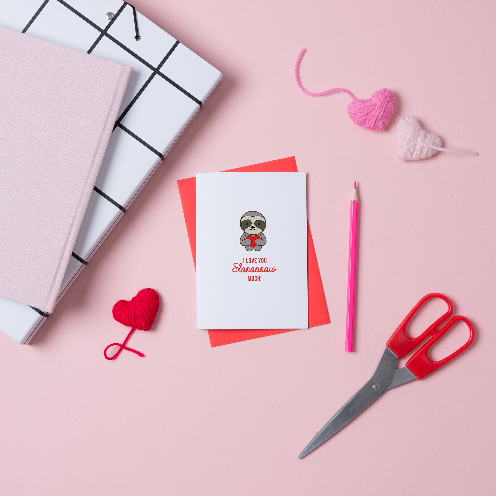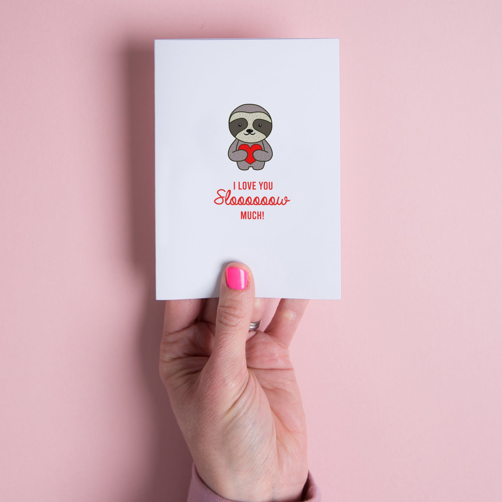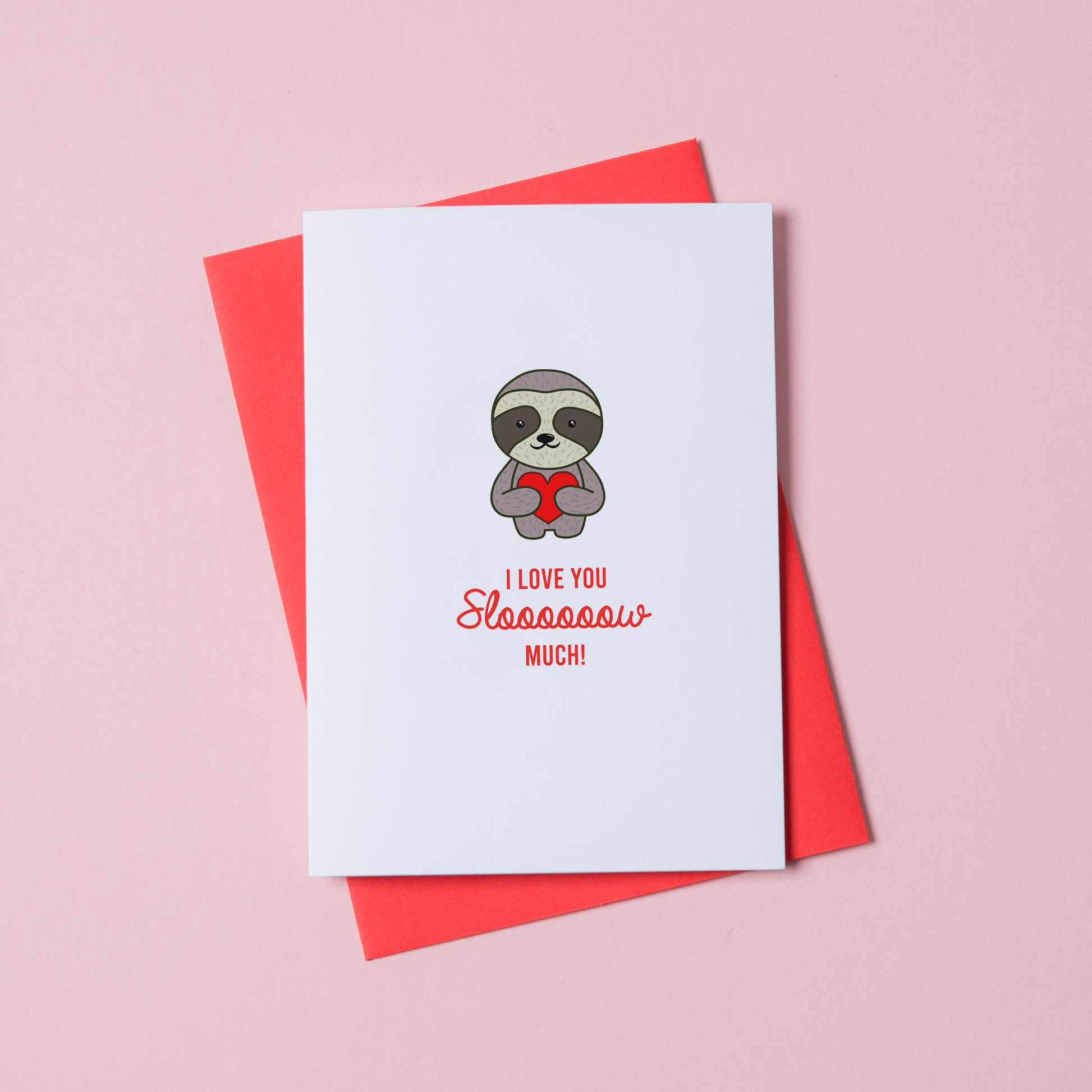 Show your love for the sloth in your life with our Sloth Love Card from Miss Shelly Designs. This handmade card features a sloth holding a red heart and the punny phrase "I love you slooooow much."